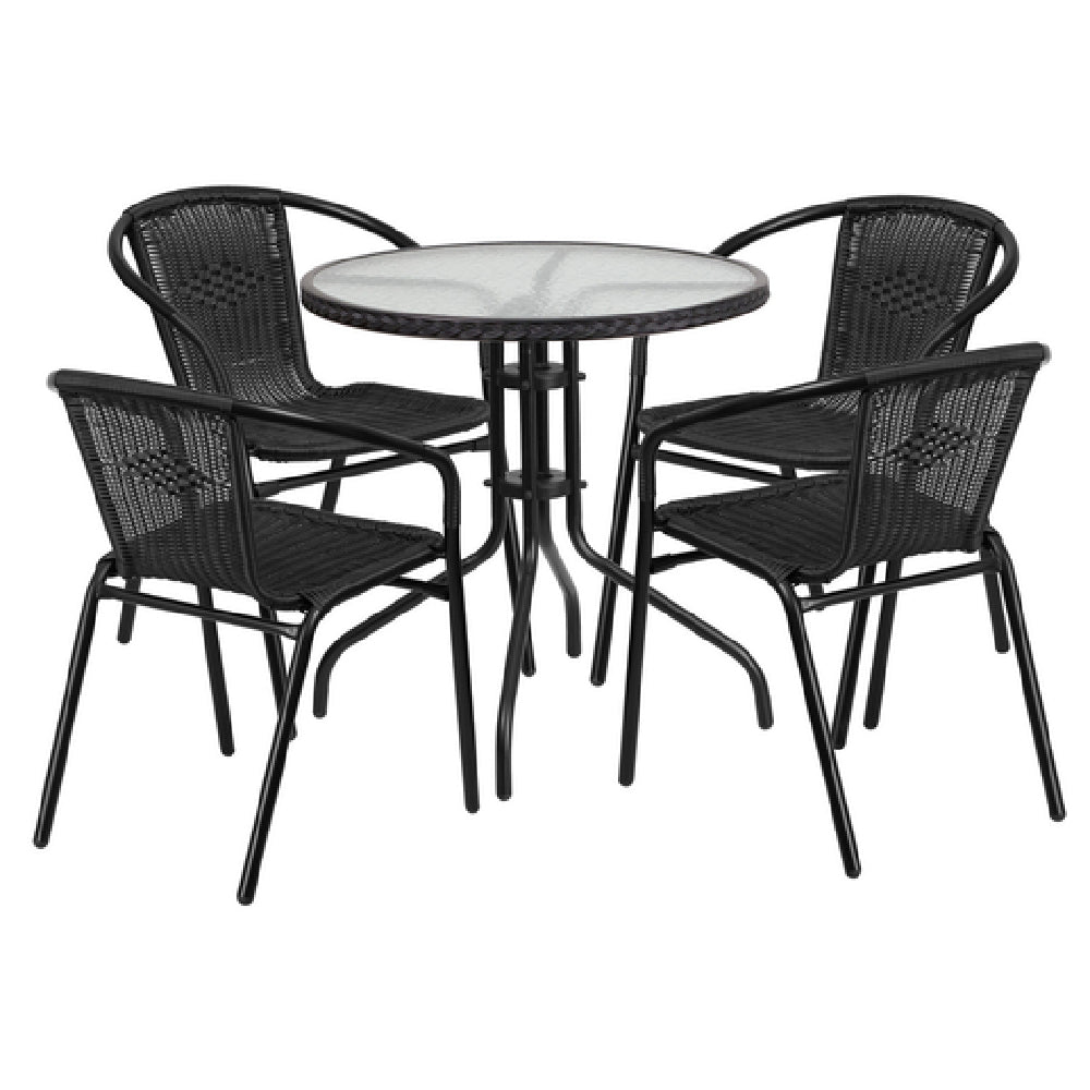 The Flash Furniture TLH-087RD-037BK4-GG Chair & Table Set is a durable outdoor dining solution designed for commercial environments requiring reliable performance and style. This set includes a 28-inch diameter, 28-inch high round table with a 5mm thick glass top featuring a 1-3/8-inch thick edge and a decorative black rattan band. The black powder-coated metal base provides structural stability, while protective plastic floor glides facilitate smooth mobility across varied surfaces. The set includes four lightweight stacking café armchairs with curved backs, black rattan seats and backs, and a black powder-coated metal frame, making it suitable for indoor and outdoor use. Assembly is required, and the set ships in two boxes, typically within 24 hours of stock availability. This furniture is ideal for commercial dining, café patios, and hospitality settings seeking a stylish yet functional outdoor arrangement with technical precision.