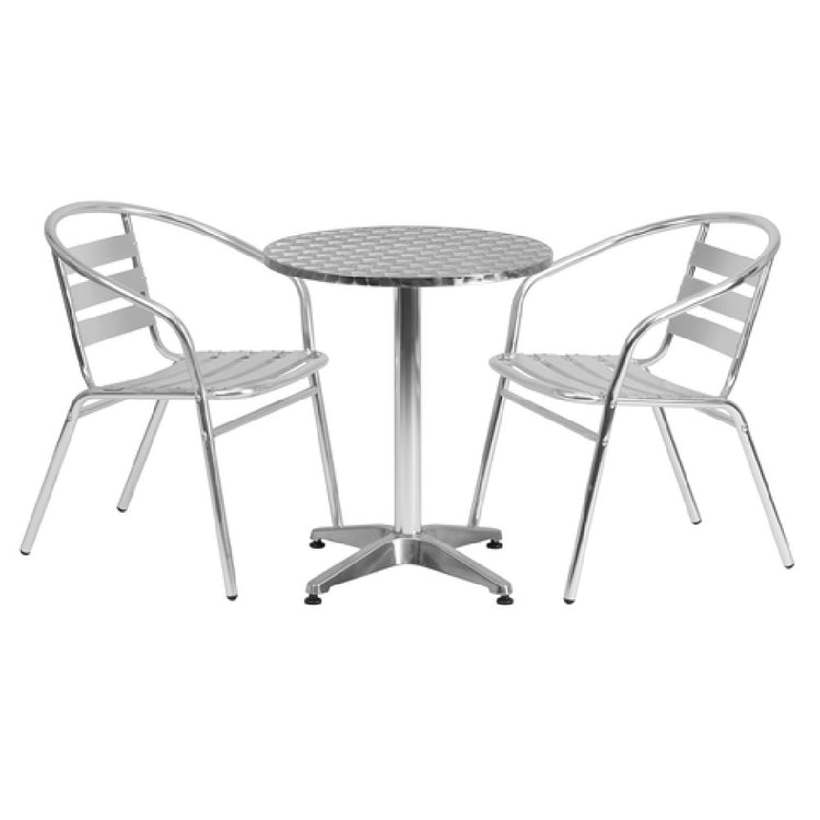 This set features a stainless steel tabletop measuring 23-1/2 inches in diameter and 27-1/2 inches in height, supported by a durable aluminum column and base for stability and weather resistance. The chairs measure 21-3/4 inches wide, 22 inches deep, and 29 inches high, with nesting capability for efficient storage. Weighing approximately 26 lbs, the set is lightweight yet sturdy for frequent repositioning. It supports typical moderate-use outdoor environments with a weather-proof aluminum and stainless steel build. Assembly is required, with details optimized for quick setup and minimal maintenance. The materials are compatible with routine cleaning and outdoor conditions, making it suitable for hospitality, outdoor cafés, and patio seating.