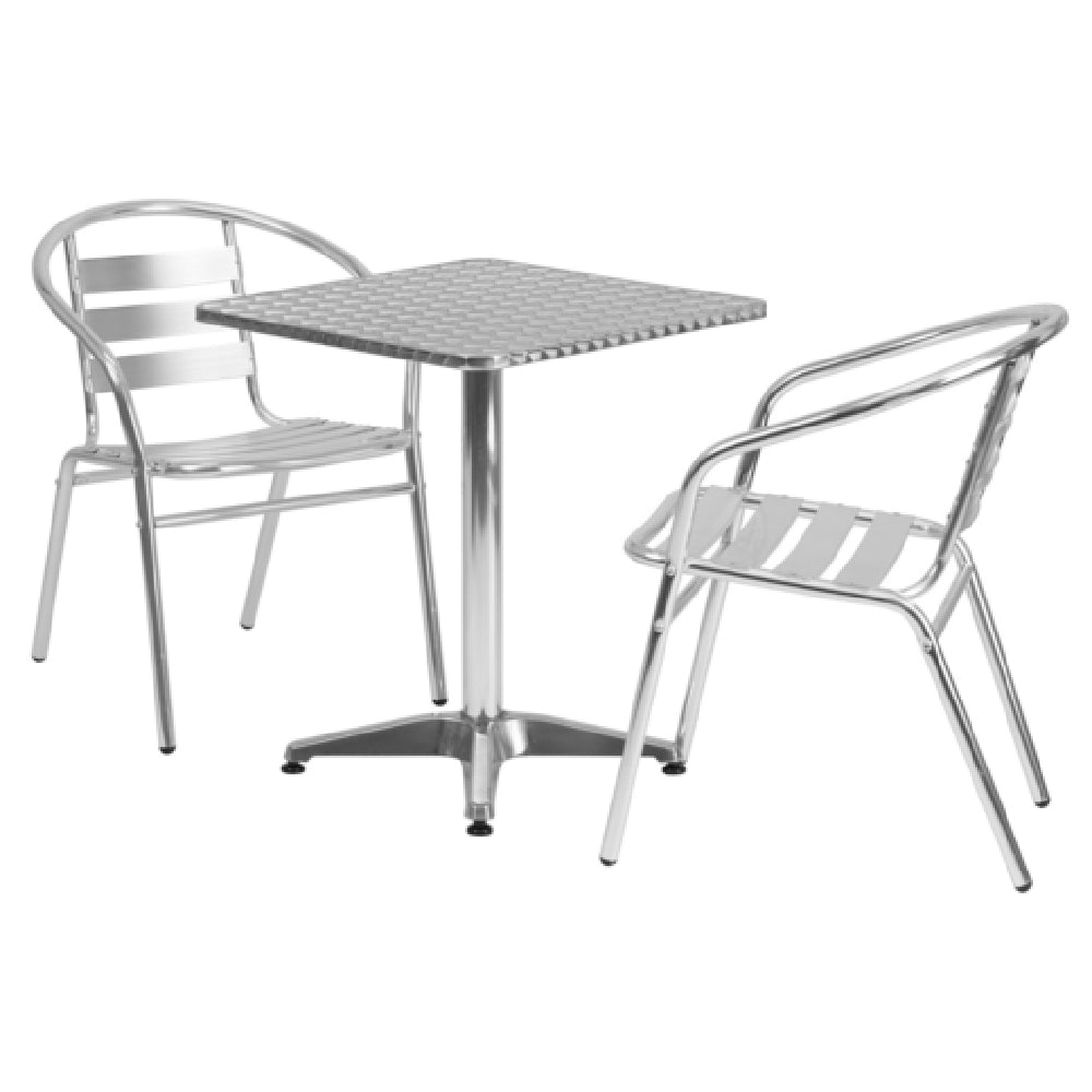 This commercial outdoor table and chair set built with stainless steel and aluminum offers weather-resistant durability and practical stackable design, ideal for outdoor dining, patio hospitality, and social areas with moderate throughput. Flash Furniture TLH-ALUM-24SQ-017BCHR2-GG ensures stable, durable performance in diverse outdoor foodservice environments, supporting efficient space management and maintenance routines.