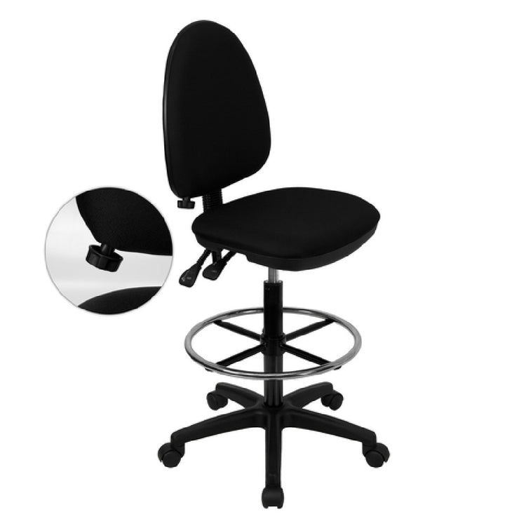 Flash Furniture, WL-A654MG-BK-D-GG, Swivel Drafting Stool, 43" to 47-1/2" adjustable height, 250 lb. weight capacity, multi-functional, mid-back design, contoured waterfall seat, fabric upholstery, adjustable lumbar support, double paddle control mechanism, 4-1/2" adjustable height back, infinite-locking back angle adjustment, without arms, height adjustable chrome foot ring, CA117 fire retardant foam, heavy duty black nylon base, dual wheel casters, black (assembly required) (in stock items usually ship within 24 hours)