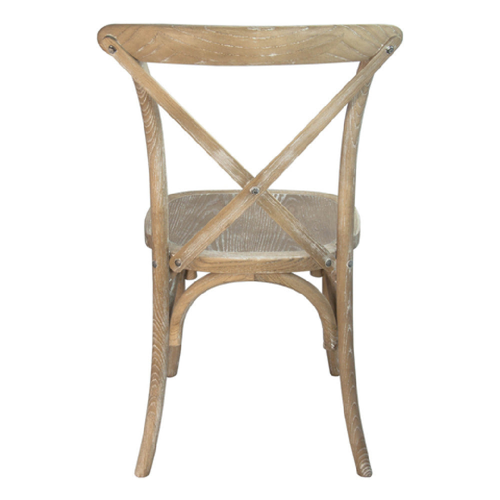 This model features a robust construction with a height of 35 inches, width of 17.5 inches, and depth of 21.5 inches, providing ergonomic support in a compact footprint. The chair weighs 17 lbs and is designed exclusively for indoor use, with a veneer seat and a criss-cross back for comfort. It supports a maximum weight of 400 lbs, suitable for various body types in commercial environments. The chair ships fully assembled and is built from durable elmwood finished in a natural tone with white grain, facilitating quick setup and minimal maintenance. Its construction ensures stability under continuous usage, making it a reliable choice for busy establishments. The absence of electrical or refrigeration components confirms it is purely seating equipment, optimized for indoor hospitality spaces.