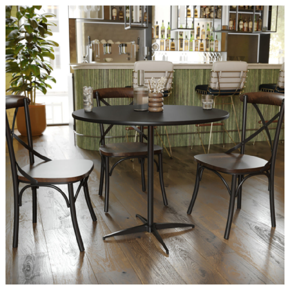 The Flash Furniture XA-36-COTA-BK-GG features a self-contained construction with dimensions of 36 inches in diameter and a height adjustable from a base of 30 inches to 42 inches. Weighing 29.1 lbs, it’s built for frequent handling and repositioning within busy foodservice environments. Its sturdy wood surface, finished in black, offers a resilient top for foodservice tasks involving light to moderate loads. The table is designed with a proprietary adjustment mechanism, requiring no electrical components—just manual height regulation. Its material composition ensures compatibility with standard cleaning agents without compromising material integrity. Operating within normal ambient conditions, it operates reliably in typical hospitality temperature ranges without safety concerns related to material temperature tolerance. The table is configured for indoor use only and features a design that supports easy disassembly for cleaning and setup. The product is prop65 compliant and suitable for frequent sanitation routines.