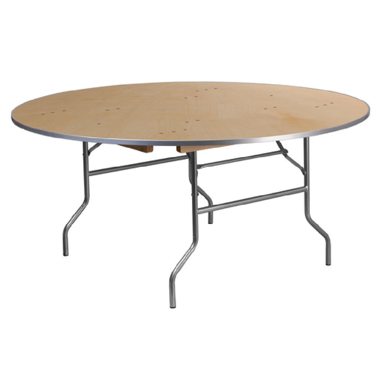 The Flash Furniture XA-66-BIRCH-M-GG Heavy Duty Folding Banquet Table is a durable, professional-grade round folding table designed for commercial food service environments. Measuring 66 inches in diameter and standing at a height of 30 inches, this banquet table features a round surface with a 3/4-inch thick plywood core topped with a birchwood hardwood surface, providing excellent strength, resistance to wear, and a smooth finish. The table’s static load capacity of 661 pounds makes it suitable for accommodating up to nine adults in various hospitality, catering, or event settings, ensuring reliable performance during high-flow service periods. Its aluminum edge and quadruple-coated polyurethane varnish top enhance durability and ease of maintenance, maintaining an attractive appearance over extended use. Heavy-duty wood runners facilitate stacking, while the steel wishbone legs with protective floor caps contribute to stability and corrosion resistance, making this table a versatile choice for demanding commercial applications.