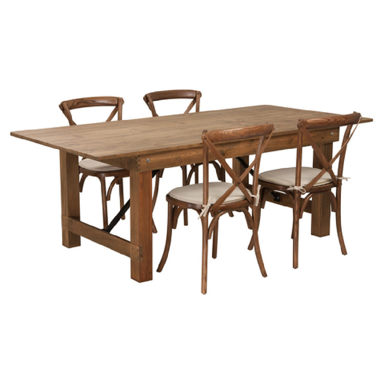 This farm table set is engineered for commercial foodservice settings, providing stable, easy-to-clean surfaces with a solid pine construction designed for frequent use. The stacking chairs feature a pecan finish ash wood cross-back frame with included seat cushions, supporting up to 400 lbs each. The foldable table allows efficient space management, facilitating quick setup and tear-down in busy environments. Plastic floor glides protect surfaces and enhance stability during operation, making it ideal for catering, cafes, and communal dining areas.