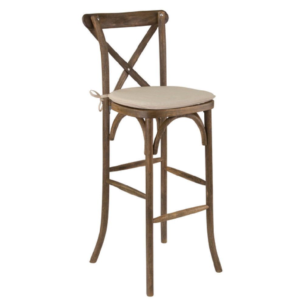 The Flash Furniture XA-X-BAR-GO-BC-GG Hercules Series Stacking Bar Stool is a professional-grade indoor seating solution engineered for high-capacity commercial and residential environments. Designed to support up to 600 pounds, this armless stool features a durable wood seat and cross back for stability and comfort. Its floor-gliding construction enables easy stacking up to five chairs, facilitating efficient space management. The included 1" thick burlap cushion enhances user comfort and durability. Constructed with a robust wood frame and finished in a dark antique tone, this model offers both aesthetic appeal and functional longevity. Fully assembled and ready for immediate deployment, it provides a reliable seating option for hospitality, entertainment, and other high-traffic venues requiring sturdy, versatile stools.