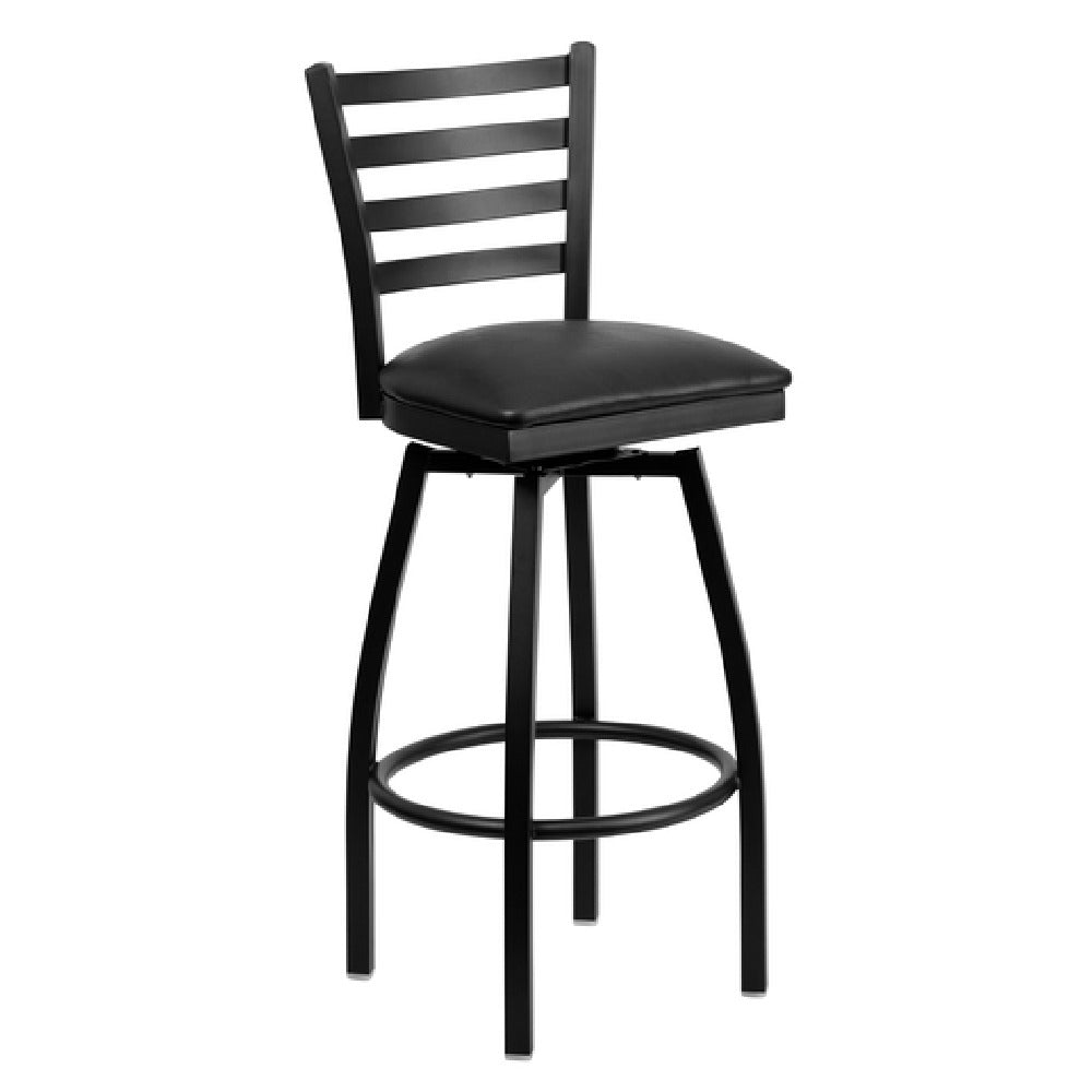 The Flash Furniture XU-6F8B-LADSWVL-BLKV-GG Hercules Series Bar Stool exemplifies a commercial-grade indoor swivel seating solution designed for high-traffic hospitality and foodservice environments. Crafted with a durable 16 gauge steel frame finished in a black powder coating, this bar stool features a metal ladder back and a padded swivel seat upholstered in black vinyl. The seat incorporates 2-1/2" thick CA117 fire-retardant foam for safety and comfort, while a built-in footrest enhances ergonomic support. Its technical specifications include a height of 44.5 inches, width of 16.5 inches, and depth of 20.5 inches, providing stable seating for bar-height applications. This model is engineered for durability, ease of maintenance, and versatile indoor use, making it suited for commercial bars, restaurants, and catering facilities seeking reliable, restaurant-ready seating options.