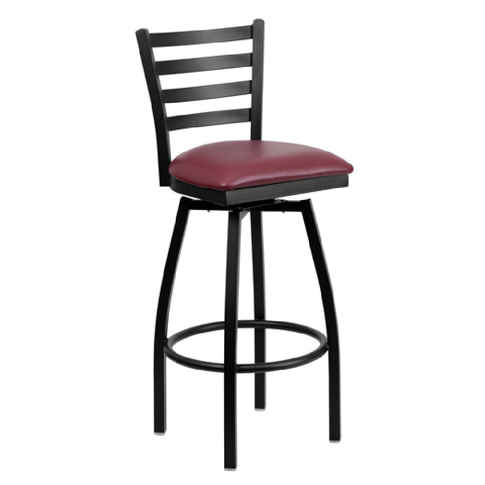 The Flash Furniture XU-6F8B-LADSWVL-BURV-GG Hercules Series Bar Stool is a professionally engineered indoor seating solution designed for commercial foodservice environments. Constructed with a 16-gauge steel black powder-coated frame, it offers exceptional durability and corrosion resistance. The ladder-style metal back provides ergonomic support, while the burgundy vinyl upholstered padded swivel seat, with 2-1/2" CA117 fire retardant foam, ensures occupant comfort and safety during extended use. This versatile bar stool is ideal for high-traffic hospitality settings, including bars, cafes, and casual dining areas, with precise dimensions of 16.5 inches width, 20.5 inches depth, and a height of 44.5 inches, making it suitable for various countertop heights and space configurations.