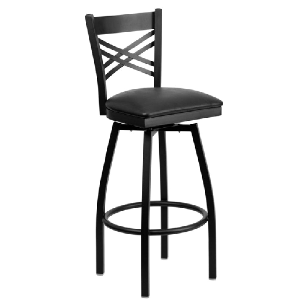 The Flash Furniture Hercules Series Bar Stool, model XU-6F8B-XSWVL-BLKV-GG, is a commercially designed seating solution optimized for indoor high-traffic environments such as bars, restaurants, and hospitality venues. Crafted with a durable 16-gauge steel frame finished in black powder coating, it features a metal X-back for stability and support. The padded seat utilizes black vinyl upholstery with 2-1/2" thick CA117 fire retardant foam, providing comfort and safety for extended use. Its swivel mechanism enhances versatility in social or order-taking settings, while a built-in footrest supports ergonomic seating. The overall height measures 44.5", with a width of 16.5" and depth of 20.5". The product's robust construction ensures longevity in commercial applications, making it a reliable choice for high-volume service areas requiring swift turnover and easy maintenance.