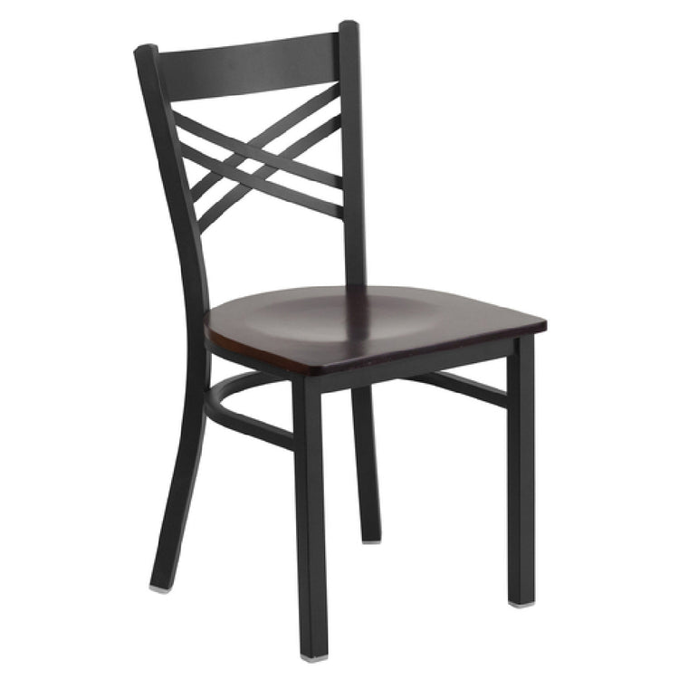 The Flash Furniture Hercules Series Restaurant Chair Metal X-back (Model XU-6FOBXBK-WALW-GG) is a commercial-grade indoor side chair designed for high-traffic foodservice environments. Constructed with a welded joint assembly and an 18-gauge steel black powder coated frame, this chair offers durability and long-term performance. The 5/8" thick walnut finish plywood seat and metal criss-cross back provide both strength and aesthetic appeal for restaurants, cafés, and hospitality venues. Its precise mechanics ensure stability under frequent use, making it a reliable choice for mid-volume dining operations seeking a balance of comfort, robustness, and style.