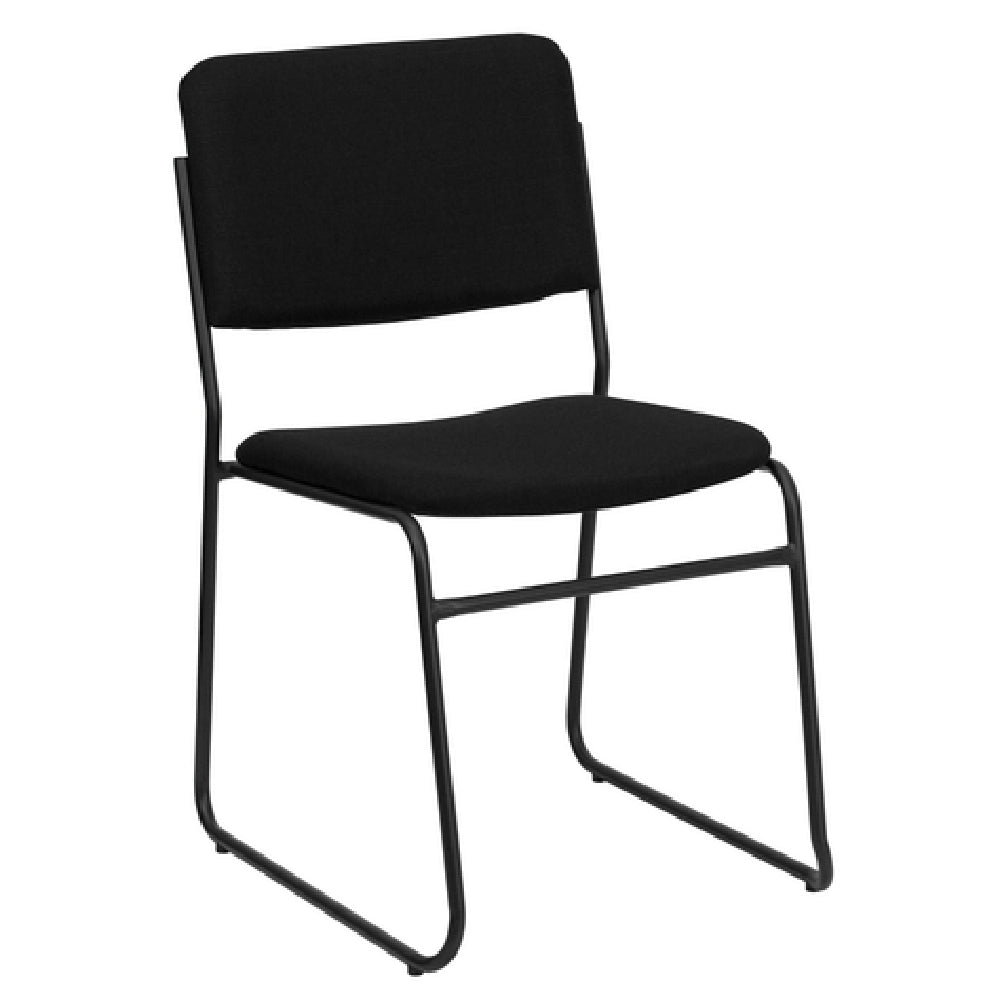 This stacking chair features a durable 17-gauge steel frame with a black powder coating to resist corrosion and wear. Its overall height is 32.25 inches, with a width of 19 inches and a depth of 21.75 inches, accommodating standard adult seating comfortably. The seat is upholstered in fabric with CA117 fire retardant foam, ensuring occupant safety and comfort. Weighing 11 lbs. per unit, the chair includes plastic floor glides for protection and stability during stacking. Designed for indoor use, it does not require electrical or cooling systems, focusing solely on robust craftsmanship and ease of maintenance. The chair supports an operating environment within typical indoor temperature ranges, and its construction ensures longevity against frequent stacking and handling. Shipping weight and handling are streamlined for quick deployment in high-volume settings.