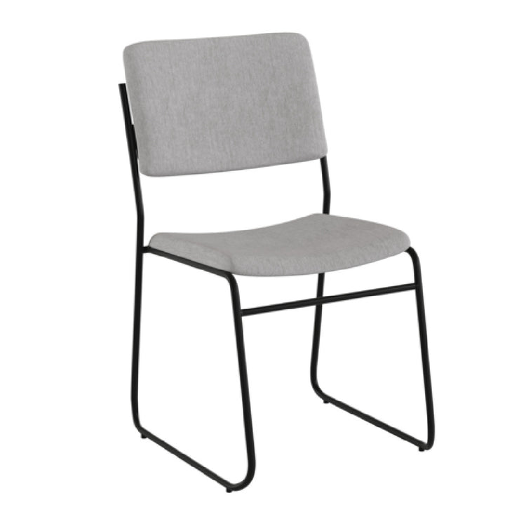 The Hercules Series stacking chair is constructed from 17 gauge steel with a weight of 16 lbs, supporting a maximum load of 1000 pounds. Its dimensions measure 18.75 inches in width, 23.75 inches in depth, and 32.5 inches in height. The fabric-upholstered seat includes CA117 fire-retardant foam, providing safety and comfort. The chair's black sled base frame is equipped with plastic floor glides to prevent floor damage. Designed for indoor use, the chair features a sturdy, high-density construction with a capacity suitable for high-volume seating in busy foodservice operations. It stacks up to 30 chairs high, offering efficient storage and quick deployment. The model is available for immediate shipment, with typical handling within 1 to 2 days.