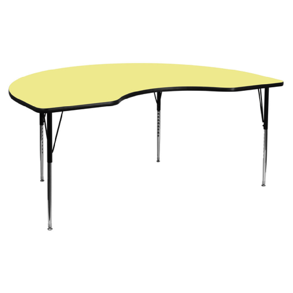 The Flash Furniture XU-A4896-KIDNY-YEL-T-A-GG Activity Table is a commercial-grade indoor activity table designed for educational and recreational environments. Measuring 96 inches in width and 48 inches in depth, with an adjustable height range of 21-1/8 inches to 30-1/8 inches, this kidney-shaped table offers a versatile workspace for children. Its 1-1/8-inch thick thermal fused yellow laminate top presents a scratch and stain-resistant surface, enhancing durability under frequent use. The black edge band material provides additional protection, while the 16-gauge tubular steel legs with black powder coating and chrome lower legs ensure stability and corrosion resistance. Self-leveling floor glides improve safety and ease installation, making this table suitable for collaborative activities in educational, daycare, or activity room settings.