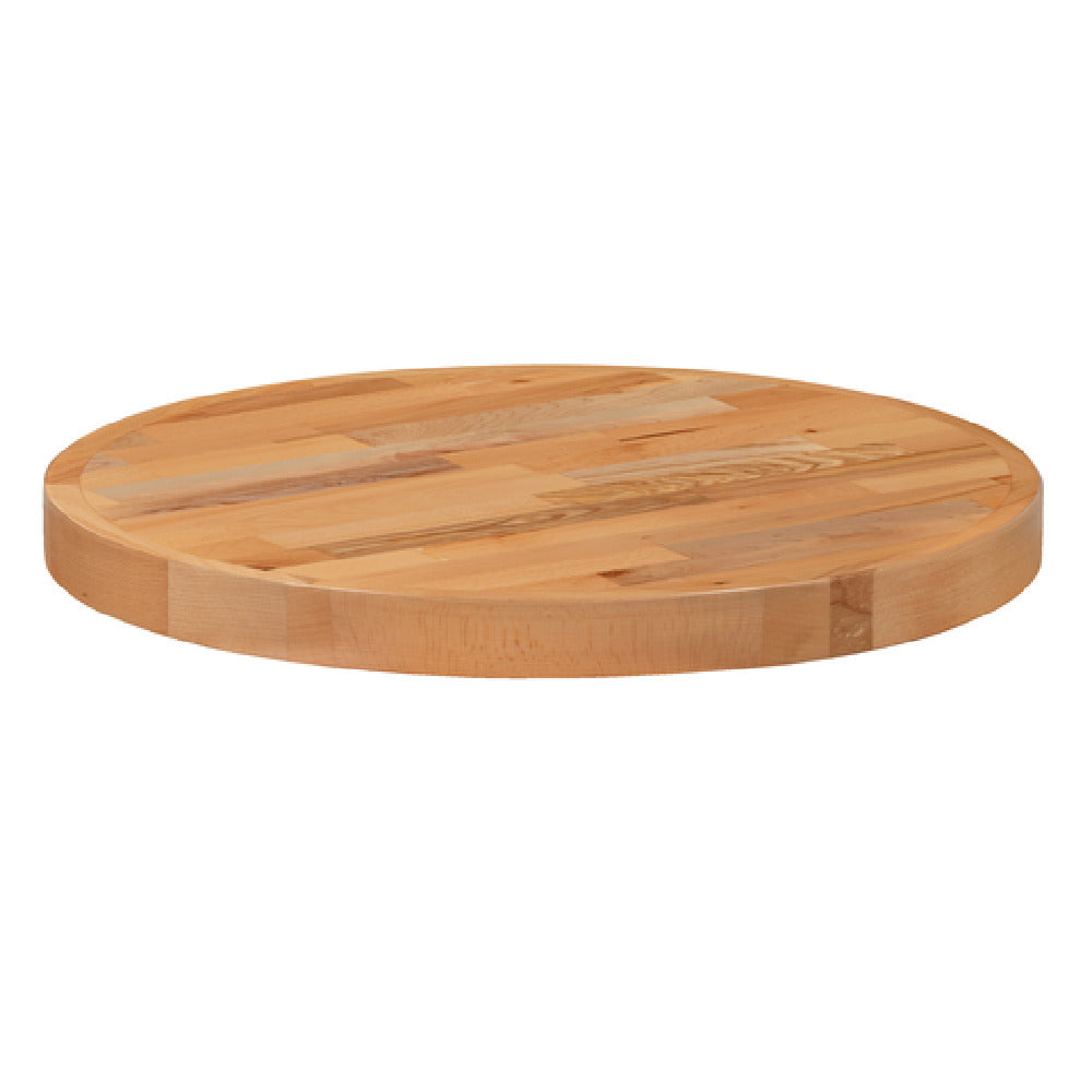 This round butcher block tabletop is tailored for commercial foodservice settings requiring resilient, easy-to-maintain surfaces. Its 24-inch diameter accommodates compact workstations and buffet stations, offering a stable, food-safe platform that withstands everyday use. The wood material ensures longevity, while its size and shape facilitate efficient workflow and space utilization in diverse kitchen layouts.