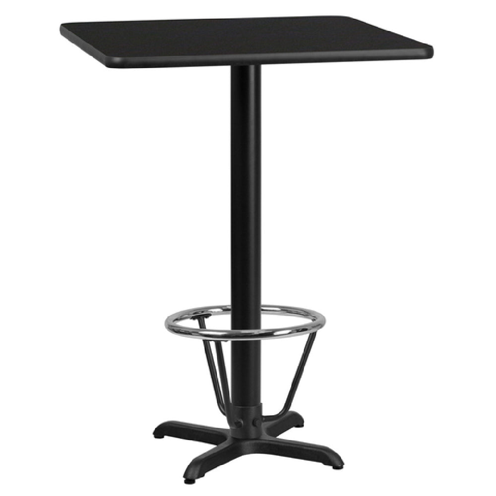 This commercial indoor bar height table provides a sturdy square surface with a 1-1/8\" thick MDF melamine core, suitable for high-traffic environments. Its black laminate finish coupled with PVC T-molding edges enhances durability and ease of cleaning. The four-point base with a chrome foot ring supports stable placement and ergonomic comfort, while assembly is straightforward with a pre-welded top plate. These features cater to busy hospitality setups requiring reliable, easy-to-maintain furnishings with a stylish appearance.