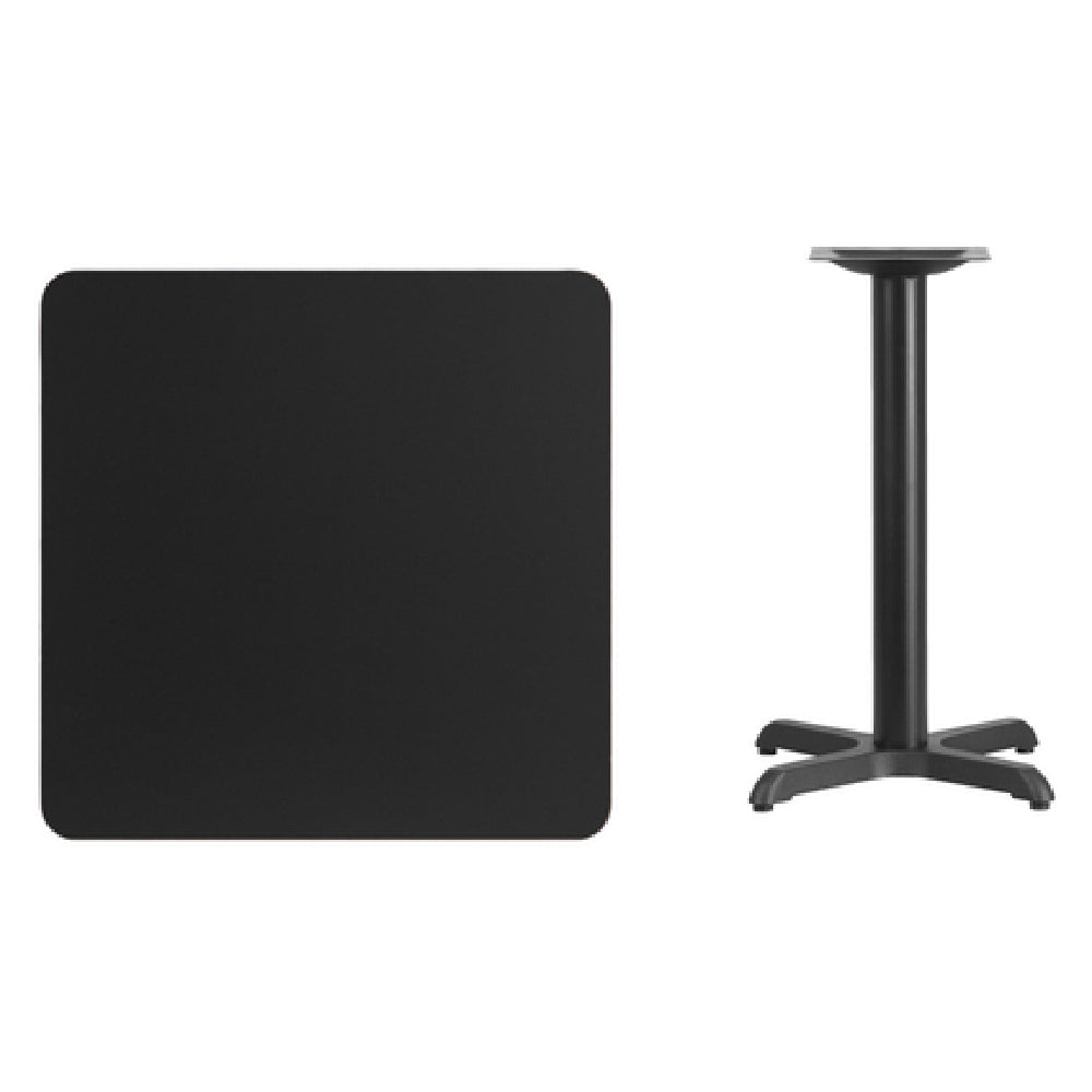 The Flash Furniture XU-BLKTB-3030-T2222-GG measures 30 inches in width and depth with a height of 31-1/8 inches, supporting typical dining height requirements. The tabletop’s construction includes MDF with a melamine core, finished with a durable black laminate, and an impact-resistant PVC edge. Its pedestal base features a 22" x 22" support footprint with a 3-inch cast iron column, finished in black powder coating for enhanced durability. The overall weight of the table is 44.75 pounds, designed for straightforward installation and ongoing maintenance. The product is intended for indoor use in settings with standard electrical and flooring requirements, with a freight class of 70 and typically ships within 1 to 2 days. It conforms to safety standards for commercial furniture and is built to withstand typical foodservice operational conditions, including temperature variations and frequent cleaning routines.