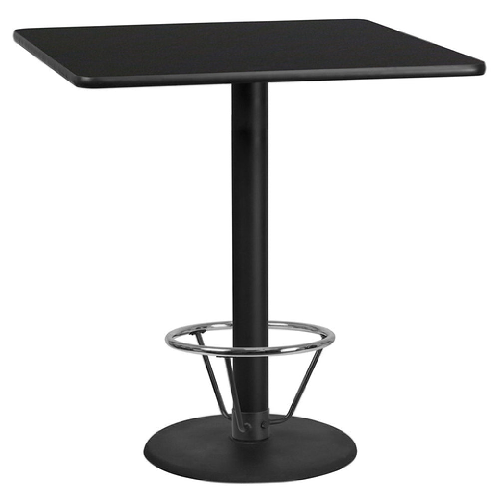The Flash Furniture XU-BLKTB-4242-TR24B-4CFR-GG Table is a commercial-grade indoor bar-height table designed to serve high-traffic foodservice environments. Measuring 42 inches in width and depth with a height of 43-1/8 inches, this square table features a 1-1/8-inch thick MDF top with a melamine core, finished with durable black laminate and reinforced by a black PVC T-mold edge. Equipped with a pre-welded top plate, a 24-inch diameter round base, and a 4-inch cast iron column with black powder coating, it offers stability and resilience. The chrome foot ring enhances user comfort, making it suitable for bar seating or high-top setups in restaurant, cafe, or hospitality applications. Its rugged construction and precise dimensions cater to demanding commercial usage, ensuring longevity and reliable performance in dynamic foodservice settings.