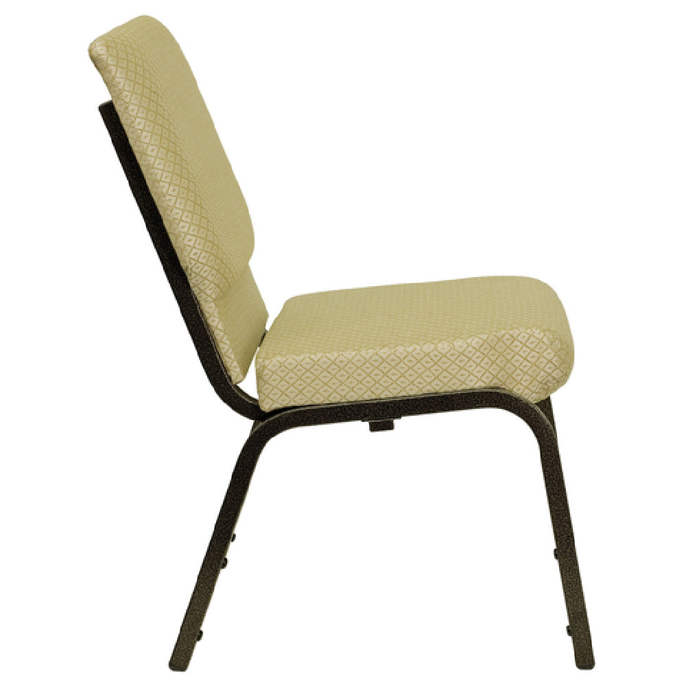 The Hercules Series stacking church chair XU-CH-60096-BGE-GG features a durable 16-gauge steel frame finished in an elegant gold vein tone, supporting a total weight of 16 lbs. with a maximum load capacity of 800 pounds. It measures 19 inches wide, 24 inches deep, and 33 inches high. The seat and back are upholstered with patterned polyester and padded with fire-retardant foam compliant with CA117 standards. It accommodates moderate to high-volume usage, such as church seating, conference rooms, or educational institutions. The chair is designed for easy stacking and secure ganging, with plastic glides that protect flooring from scuffs. Assembly is required, with tools provided. This model is not fitted with electric features or refrigeration components but adheres to safety standards, ensuring reliable, ongoing performance in busy environments.