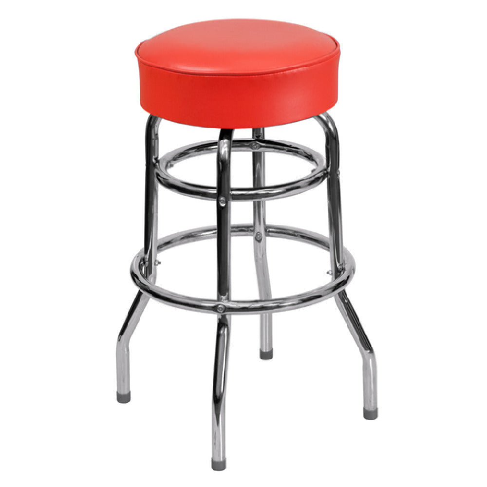 The Flash Furniture XU-D-100-RED-GG Bar Stool is a commercial-grade, backless seating option designed for indoor use in hospitality and foodservice environments. This model features a swivel seat upholstered in durable red vinyl with integrated padding for enhanced comfort, making it suitable for high-traffic bar and counter areas. Its 18-gauge steel double-ring chrome frame provides stability and longevity, while the rounded accent welt adds a refined aesthetic. The stool's construction incorporates CA117 fire-retardant foam, ensuring safety compliance. Its compact dimensions include a height of 30.25 inches and a width and depth of 20.5 inches, optimized for space-efficient application within busy commercial settings. The lightweight design (14.75 lbs) allows for easy repositioning, making it ideal for versatile restaurant, bar, or lounge environments. The use of commercial-grade materials ensures durability under constant use and ease of maintenance, with plastic floor glides protecting flooring surfaces.
