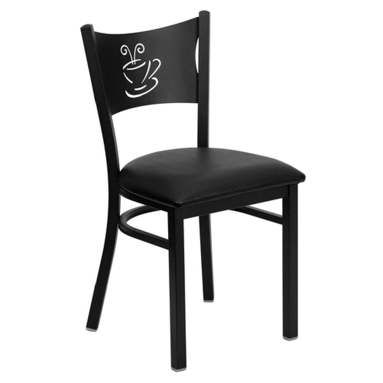 The Flash Furniture Hercules Series Restaurant Chair, model XU-DG-60099-COF-BLKV-GG, is a durable, commercial-grade seating solution designed for indoor restaurant and café environments. Featuring a metal back with a coffee cutout and a black vinyl upholstered padded seat, this chair combines functionality with modern aesthetics. It is constructed with an 18-gauge steel frame finished in black powder coating, ensuring high resistance to daily wear. The chair’s curved support bar enhances structural integrity, while welded joint assembly provides stability. Equipped with 2-1/2" thick CA117 fire retardant foam, it prioritizes safety and comfort. Ideal for high-demand foodservice settings, this chair delivers reliable performance in busy hospitality environments, with a focus on durability and ease of maintenance.