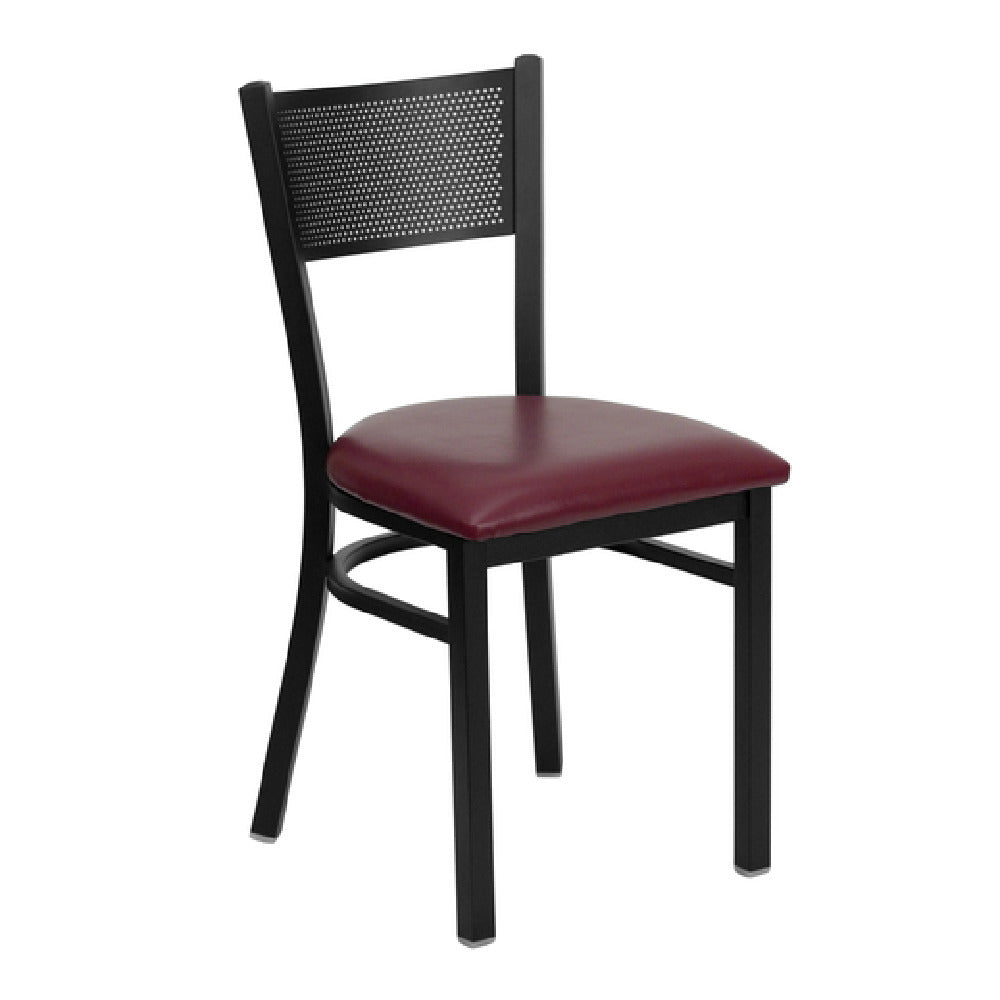 The Flash Furniture Hercules Series Restaurant Chair with Metal Back and Grid Design (model XU-DG-60115-GRD-BURV-GG) is a commercial-grade indoor side chair engineered for durability and ease of maintenance. Constructed with an 18-gauge steel frame finished in black powder coating, it features a perforated metal back with a distinctive grid pattern and a padded seat upholstered in burgundy vinyl. The seat incorporates 2-1/2" thick CA117 fire-retardant foam, ensuring comfort and safety in high-traffic foodservice environments. Welded joint assembly and curved support bar enhance structural strength, making this chair suitable for restaurant, cafe, and institutional applications demanding robust and reliable seating solutions.