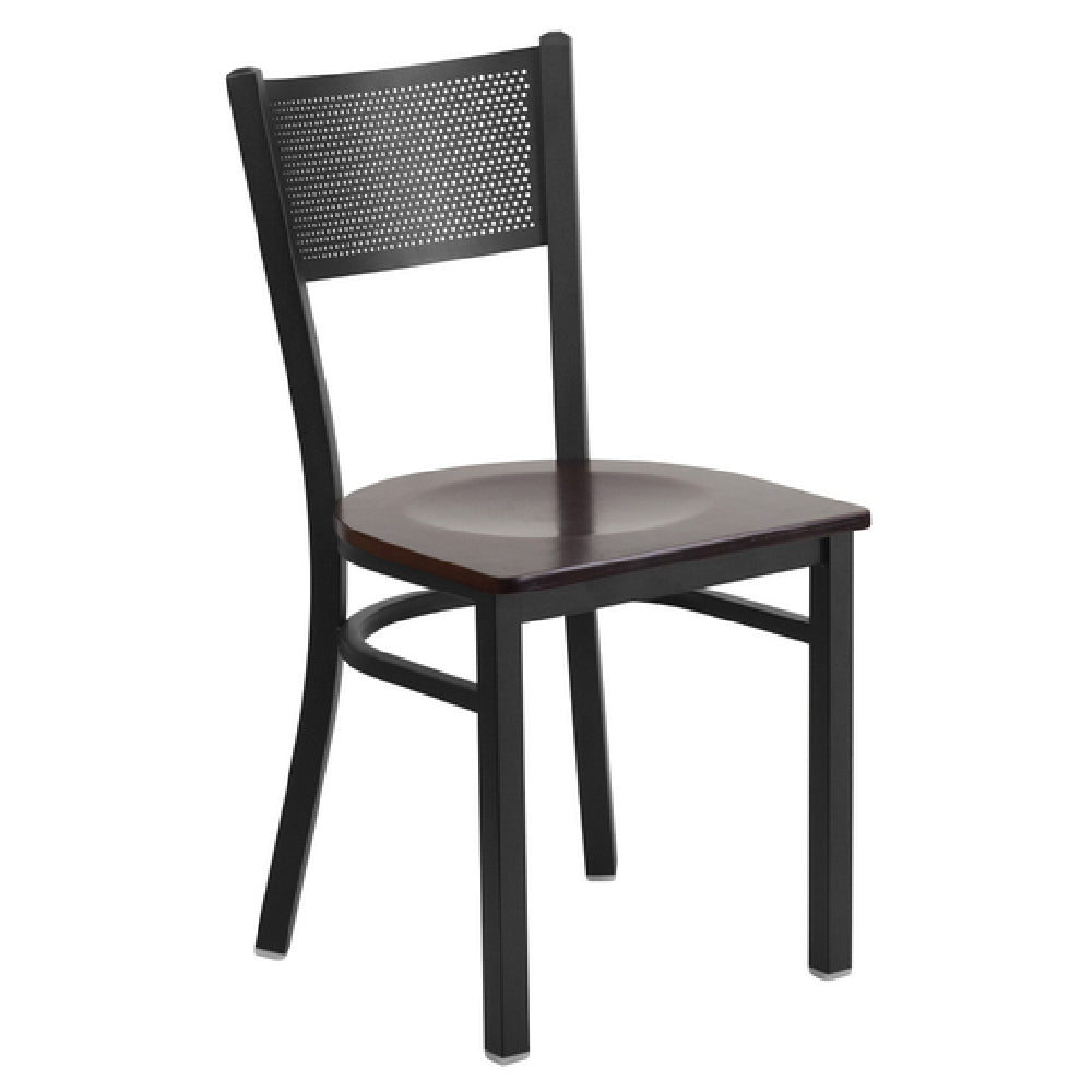 This commercial indoor side chair from Flash Furniture features a perforated metal back with grid design, optimized for durability and airflow. The seat is constructed from 5/8" thick walnut finish plywood, providing a comfortable surface for extended periods. The chair’s frame is made from 18 gauge steel with a powder-coated black finish, ensuring corrosion resistance and structural integrity. It measures 17.25" wide by 20" deep and 33.25" in height, with a weight of 14 lbs. The chair is designed to support typical dining workloads and is equipped with plastic floor glides to protect flooring. Assembly is required, with all necessary hardware included, and the chair meets general safety and durability standards for commercial foodservice settings.