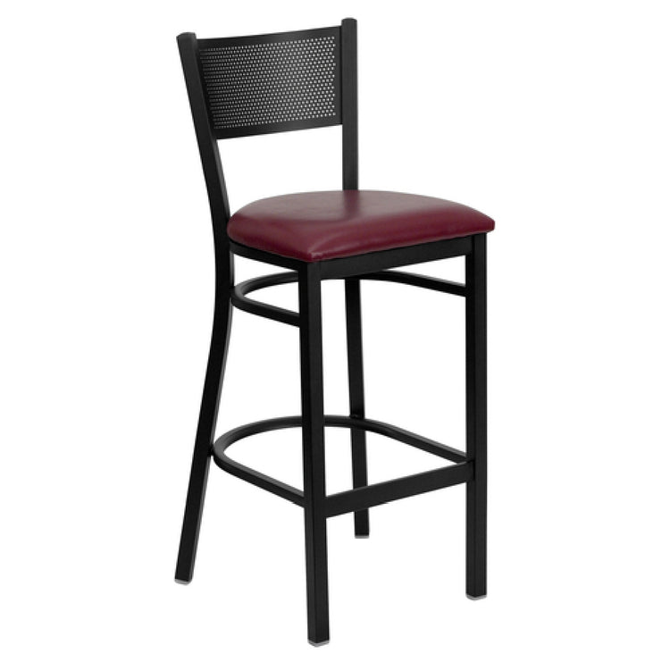 Flash Furniture, XU-DG-60116-GRD-BAR-BURV-GG, Hercules Series Restaurant Bar Stool, metal back with grid design, burgundy vinyl upholstered padded seat, 2-1/2" thick CA117 fire retardant foam, welded joint assembly, (2) curved support bars, footrest, 18 gauge steel black powder coated frame, plastic floor glides, designed for commercial use (assembly required) (in stock items usually ship within 24 hours)