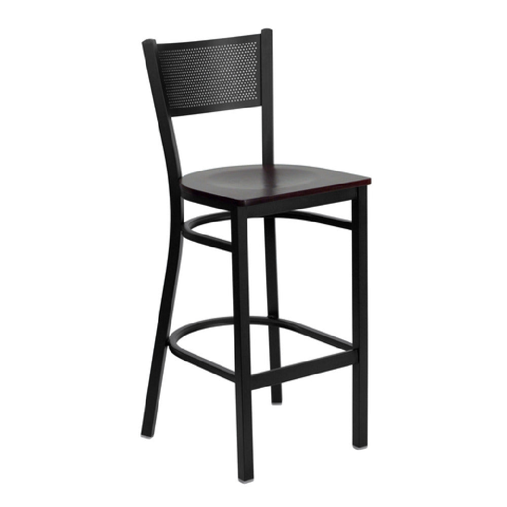 The Flash Furniture Hercules Series Restaurant Barstool (Model XU-DG-60116-GRD-BAR-MAHW-GG) is a commercial-grade indoor seating solution designed for hospitality environments requiring durable, stylish, and functional barstools. Constructed from an 18-gauge steel frame with a black powder coat finish, this stool features a metal back with a distinctive grid pattern and a 5/8" thick mahogany finish plywood seat. Its welded joint assembly ensures stability for high-traffic settings, while the inclusion of a footrest enhances user comfort and ergonomic support. Ideal for bars, cafes, and casual dining venues, this model supports efficient workflow and robust daily use in vibrant foodservice establishments, with in-stock items typically shipping within 24 hours.
