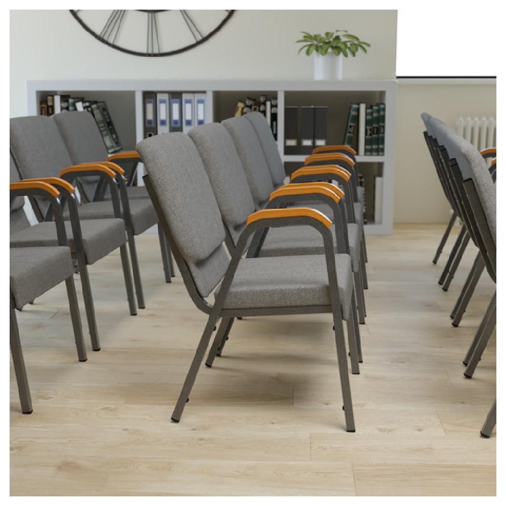 The Flash Furniture Hercules Series Arm Chair, model XU-DG-60156-GY-GG, is a durable indoor stacking armchair designed for commercial foodservice environments. Crafted with a silver vein steel frame, it features 21"W fabric-upholstered seats with integrated wood accent arms, providing both strength and aesthetic appeal. This chair is ideal for cafeterias, lounge areas, or multi-purpose dining spaces requiring versatile, space-efficient seating solutions suitable for medium-volume usage.