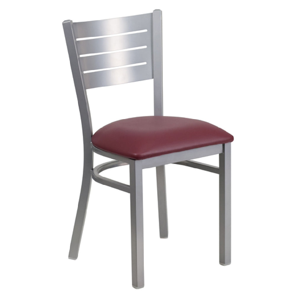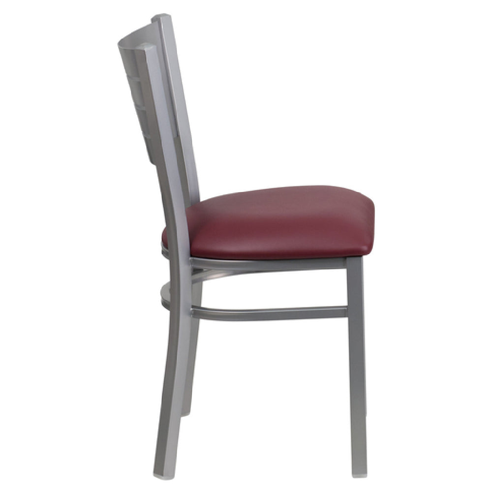 The Flash Furniture XU-DG-60401-BURV-GG Hercules Series Restaurant Chair is a durable, commercial-grade side chair designed for indoor restaurant and hospitality environments. Constructed with an 18-gauge steel frame finished in a sleek silver powder coating, it features a metal cutout slat back for aesthetic appeal and structural support. The chair’s padded seat is upholstered in burgundy vinyl and filled with 2-1/2" of fire retardant foam compliant with CA117 standards, delivering comfort and safety in high-traffic foodservice settings. Engineered for robustness and ease of maintenance, this model addresses frequent use in busy dining areas, providing stability and longevity for restaurant, café, and lounge applications. Its welded joint assembly, curved support bar, and plastic glides ensure reliable performance and smooth mobility across various flooring types. The XU-DG-60401-BURV-GG is a practical seating solution for medium-volume establishments seeking a reliable, restaurant-ready seating option with straightforward assembly and enduring construction.