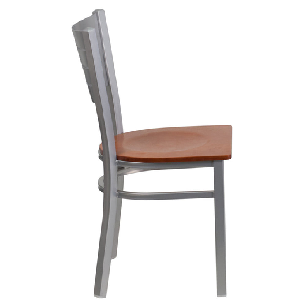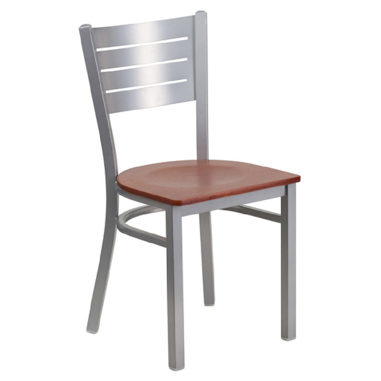 The Flash Furniture XU-DG-60401-CHYW-GG Hercules Series Restaurant Chair is a durable, high-performance indoor seating solution designed for commercial foodservice environments. Constructed with an 18-gauge steel silver powder-coated frame and welded joint assembly, this chair offers enhanced stability and corrosion resistance. The metal cutout slat back provides ergonomic support and aesthetic appeal, while the 5/8" thick cherry finish plywood seat ensures comfort and easy maintenance. This chair is engineered specifically for restaurant, café, and hospitality applications, with dimensions of 16.5 inches in width, 19 inches in depth, and a height of 33.5 inches, making it suitable for various dining settings and ensuring optimal space utilization.