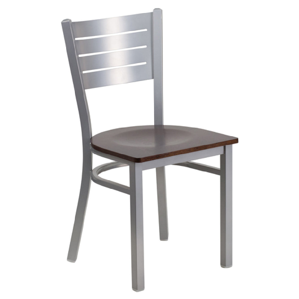 The Hercules Series restaurant chair is constructed with a robust 18 gauge steel frame finished in a silver powder coating, offering corrosion resistance suitable for prolonged commercial use. The chair’s dimensions are 16.5" in width, 19" in depth, and 33.5" in height, with a weight of 15 lbs for easy handling and rearrangement. The wood seat, measuring 5/8" thick and finished in walnut, provides a comfortable sitting surface compatible with standard restaurant settings. Designed to support typical all-day seating, this chair features a functional back style with a cutout design that promotes airflow and ease of cleaning—aligned with industry standards for health and sanitation. Assembly is required but straightforward, with optional space for stacking or arrangement flexibility.