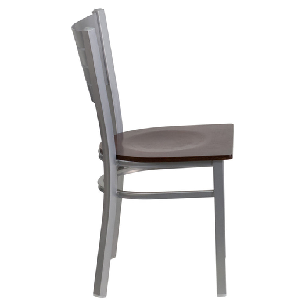 The Flash Furniture Hercules Series Restaurant Chair, model XU-DG-60401-WALW-GG, is a durable indoor seating solution designed for commercial foodservice environments. Crafted with a welded joint assembly and a 18 gauge steel frame coated in a silver powder finish, this chair ensures long-lasting strength. It features a distinctive metal cutout slat back, complemented by a 5/8" thick walnut finish plywood seat, providing both aesthetic appeal and functional seating. This chair is optimized for highfoot traffic settings such as restaurants, cafes, and hospitality venues, with precise specifications tailored for reliable performance in busy commercial applications.