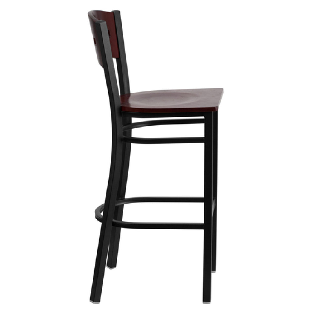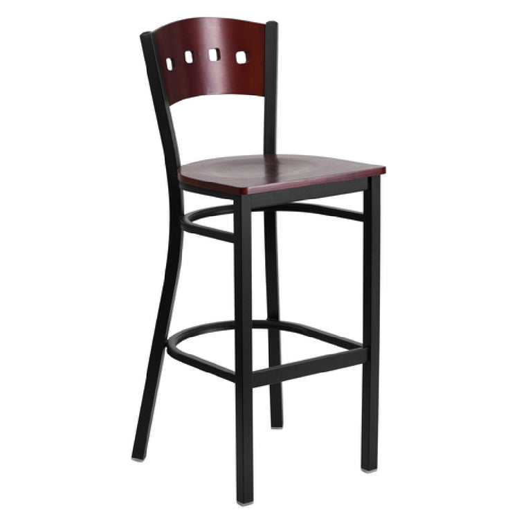The Flash Furniture Hercules Series Restaurant Bar Stool (model XU-DG-60515-MAH-BAR-MTL-GG) is a commercial-grade indoor seating solution designed for high-traffic hospitality environments. Constructed with a durable 18-gauge steel frame finished in black powder coating, it features a mahogany plywood back with four cutouts and a 5/8" thick mahogany plywood seat. The welded joint assembly ensures structural integrity, while the adjustable footrest enhances ergonomic comfort during extended use. This bar stool is engineered with an emphasis on durability, ease of maintenance, and functional performance typical of professional foodservice furniture.