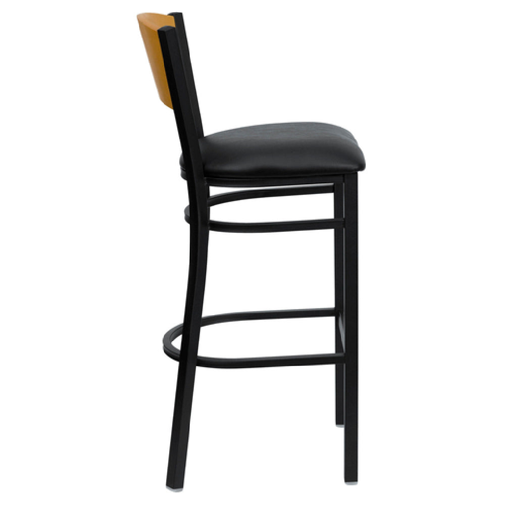 The Flash Furniture XU-DG-6F6B-CIR-BAR-BLKV-GG Hercules Series Restaurant Bar Stool is a commercial-grade indoor seating solution designed for high-traffic hospitality environments. Constructed with a natural finish plywood back featuring a distinctive circle cutout, complemented by a black vinyl upholstered padded seat for comfort and durability. This bar stool incorporates a 2-1/2" thick CA117 fire retardant foam, welded joint assembly, and two curved support bars for enhanced stability. Its 18-gauge steel frame is powder-coated in black for corrosion resistance, equipped with plastic floor glides to protect flooring surfaces. Engineered for sustained commercial use, this model emphasizes robustness and ergonomic design, optimizing both aesthetics and operational longevity in restaurant, bar, and lounge settings.