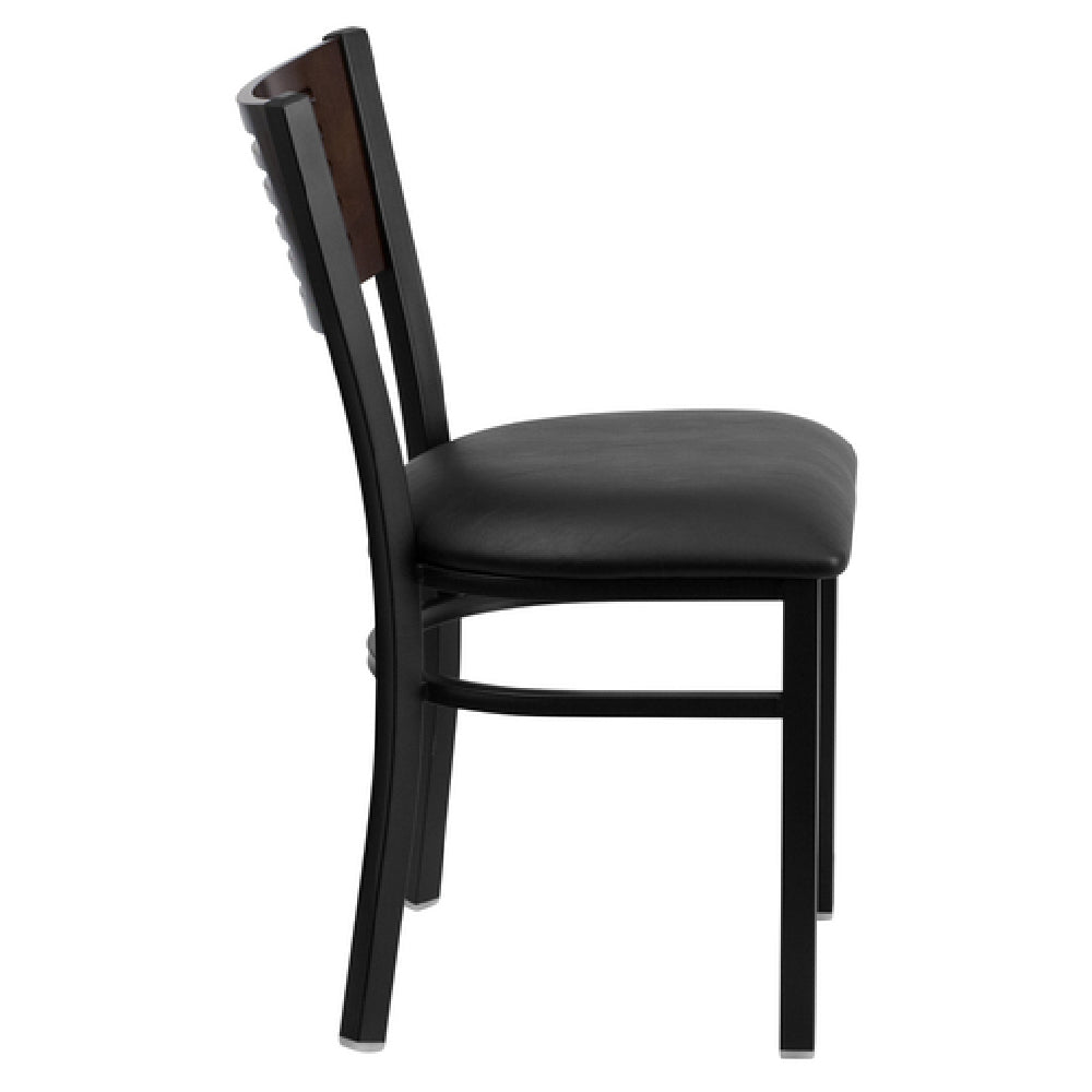 The Flash Furniture Hercules Series Restaurant Chair features a 14 lb steel frame with a black powder-coated finish, ensuring corrosion resistance suitable for indoor commercial use. The chair's plywood backrest has a slotted walnut finish for visual appeal and ventilation, while the upholstered seat in vinyl includes fire-retardant foam compliant with CA117 standards for safety. The overall dimensions are 17" wide, 21" deep, and 32" high, with a seat height optimized for comfortable seating. The welded joint assembly coupled with a curved support bar enhances stability, supporting high-traffic workloads typical of restaurant and hospitality environments. The product is designed for straightforward maintenance, with a plastic floor glide for smooth movement, and requires no electrical or water connections. Its construction and finish make it a reliable, restaurant-quality piece of commercial furniture suitable for mid-volume daily use.