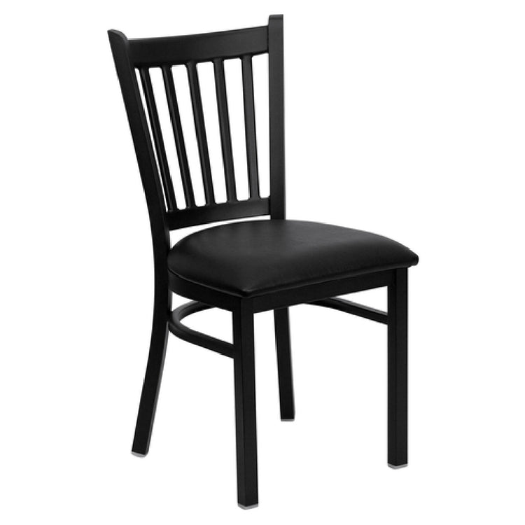 The Flash Furniture Hercules Series Restaurant Chair (Model XU-DG-6Q2B-VRT-BLKV-GG) is a commercial-grade indoor side chair designed for high-traffic dining environments. Crafted from 18-gauge steel with a durable black powder coating, it features a vertical slat back for added support and stability. The padded seat is upholstered with black vinyl and filled with 2-1/2" thick CA117 fire-retardant foam, providing comfort and safety for extended use. Welded joint assembly enhances structural integrity, making it suitable for restaurant, cafeteria, or catering settings requiring reliable, restaurant-ready seating solutions. The chair's precise dimensions—17" width, 20.25" depth, and 34.25" height—ensure easy integration into various commercial spaces.