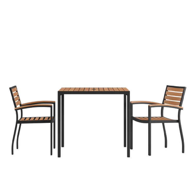 The Flash Furniture XU-DG-810060062-GG Patio Dining Table Set is a commercial-grade outdoor furniture solution designed for high durability and practical use in hospitality and foodservice environments. This set features a 35-inch square synthetic teak slotted top table with a central umbrella hole, supported by a robust steel frame. The set includes two stacking chairs with teak accented arms, optimized for space efficiency and ease of maintenance, making it suitable for outdoor restaurant patios, café seating, or courtyard dining areas. Its technical construction emphasizes weather resistance and structural stability for consistent outdoor performance.