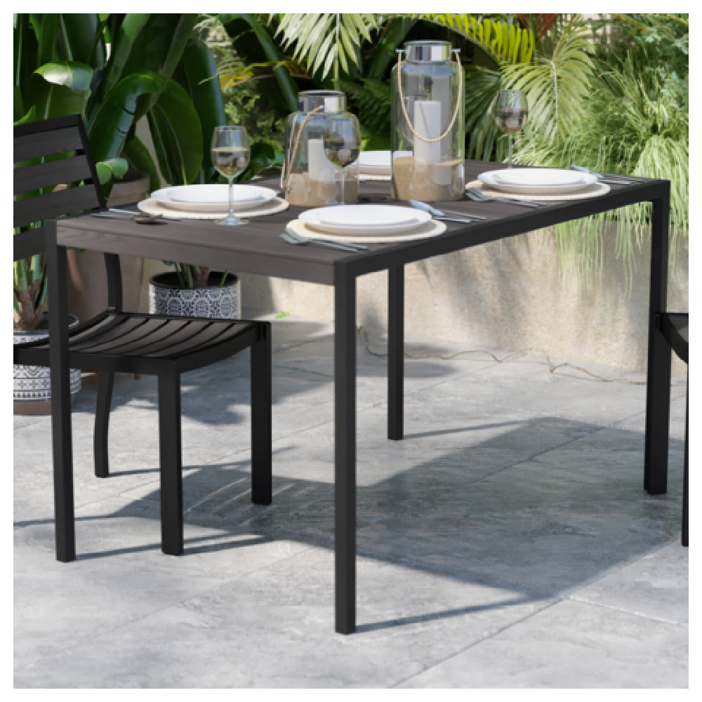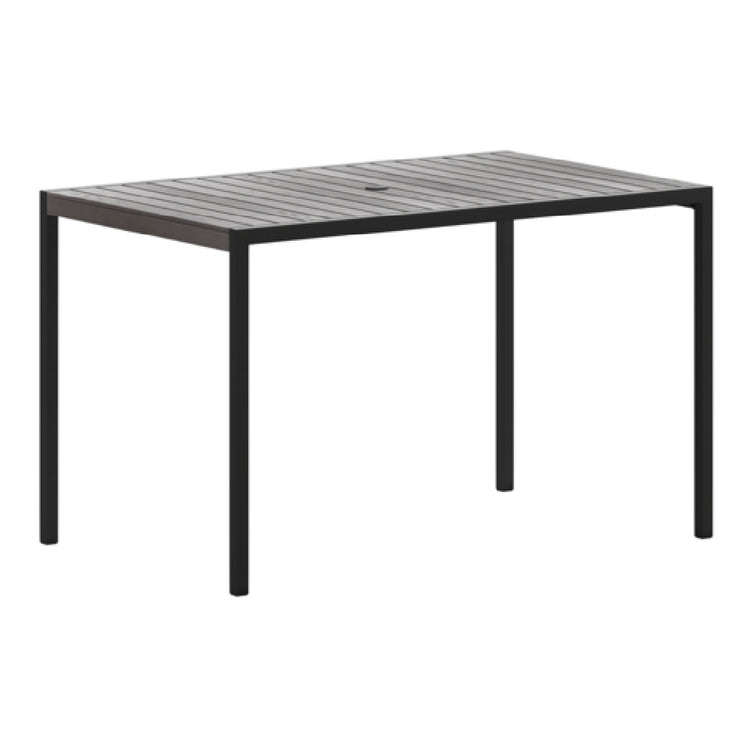 The Flash Furniture XU-DG-UH3048-GY-GG Lark Dining Table is a commercial-grade outdoor table designed for versatile hospitality environments. Measuring 30 inches wide by 48 inches deep and standing 29-1/2 inches high, this rectangular table features a synthetic teak poly slat top with a 2-1/2-inch fixed thickness, supporting a weight capacity of 300 pounds. Its steel powder-coated frame ensures durability and stability, suitable for high-traffic indoor or outdoor foodservice settings, including patios, cafes, and casual dining areas. The 1-3/4-inch umbrella hole allows for seamless parasol integration, enhancing guest comfort and sun protection during outdoor operations. This table combines functional design with weather-resistant materials, ideal for mid-volume restaurant or catering spaces seeking robust, easy-to-maintain furnishings.