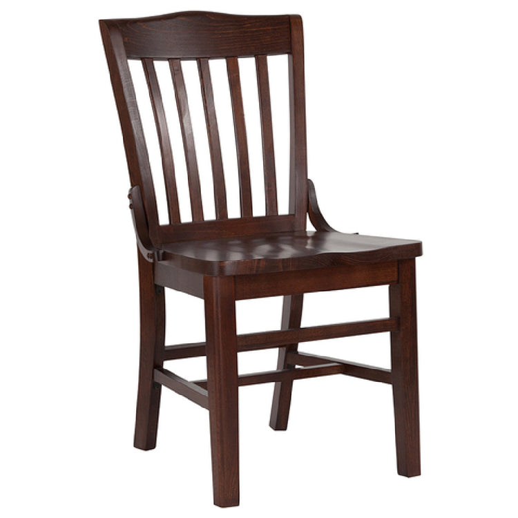 The Flash Furniture Hercules Series Restaurant Chair with Wood Schoolhouse Back (Model XU-DG-W0006-WAL-GG) is a commercial-grade side chair designed for indoor hospitality settings, including restaurants, cafes, and institutional dining areas. Crafted by Flash Furniture, this chair features a European beechwood frame finished in walnut, delivering both durability and aesthetic appeal. The 1" thick beechwood seat, combined with mortise and tenon style construction reinforced by metal wood screws, ensures structural integrity under frequent use. Its slat back style enhances support and comfort, making it suitable for high-traffic dining environments requiring reliable, long-lasting seating options.