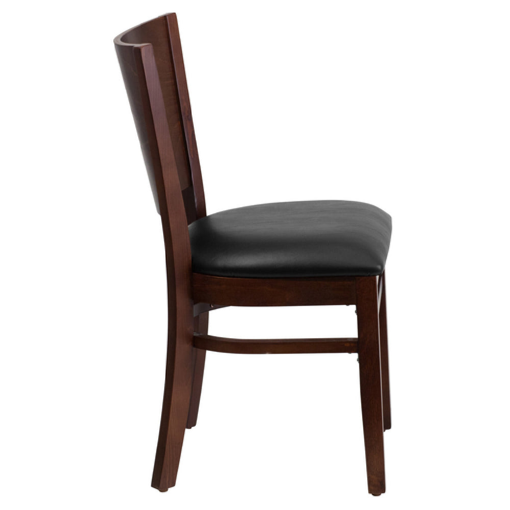The Flash Furniture XU-DG-W0094B-WAL-BLKV-GG Lacey Series Restaurant Chair with Solid Wood Back is a commercial-grade side chair designed for indoor hospitality environments. Crafted with European beechwood featuring a walnut finish, it combines durability with aesthetic appeal. The chair's solid wood back and padded vinyl seat, reinforced with 2-1/2" thick CA117 fire-retardant foam, offer comfort and safety. Built using mortise and tenon style construction with metal screw reinforcements, the chair ensures long-lasting stability. Its precise dimensions of 17.25" width, 20.5" depth, and 33.5" height make it suitable for restaurant, café, and banquet seating, supporting rigorous daily use in foodservice settings.