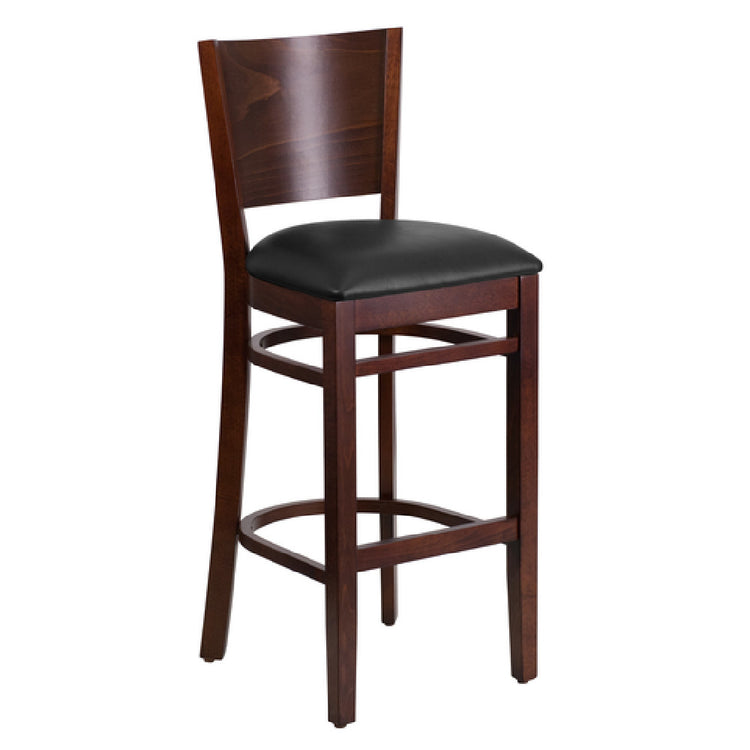 The Flash Furniture XU-DG-W0094BAR-WAL-BLKV-GG Lacey Series Restaurant Bar Stool with Solid Wood Back is a commercial-grade seating solution designed for indoor hospitality environments. This bar stool features a European beechwood frame finished in walnut, ensuring durability and aesthetic appeal in high-traffic settings. Its robust construction incorporates mortise and tenon joints with metal wood screw reinforcements, providing stability and longevity. The padded seat upholstered in black vinyl includes 2-1/2" thick CA117 fire retardant foam for comfort and safety. A solid wood back enhances ergonomic support, making it suitable for restaurant bars, hotel lounge areas, and upscale foodservice establishments. Precisely crafted for commercial use, this stool combines technical precision with functional design for demanding hospitality applications.