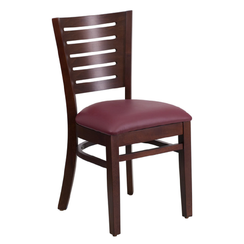 This restaurant chair delivers a robust European beechwood frame with a kiln-dried walnut finish designed for durability in high-traffic foodservice venues. Its wood slat back enhances comfort and aesthetics, supported by mortise and tenon joints with screw reinforcement, ideal for sustained daily use. The ergonomically padded burgundy vinyl seat with fire-retardant foam offers easy cleaning and long-lasting resilience, suited for moderate volume dining environments. With plastic floor glides and a curved support bar, it maintains stability and protects flooring, seamlessly integrating into restaurant or café workflows.