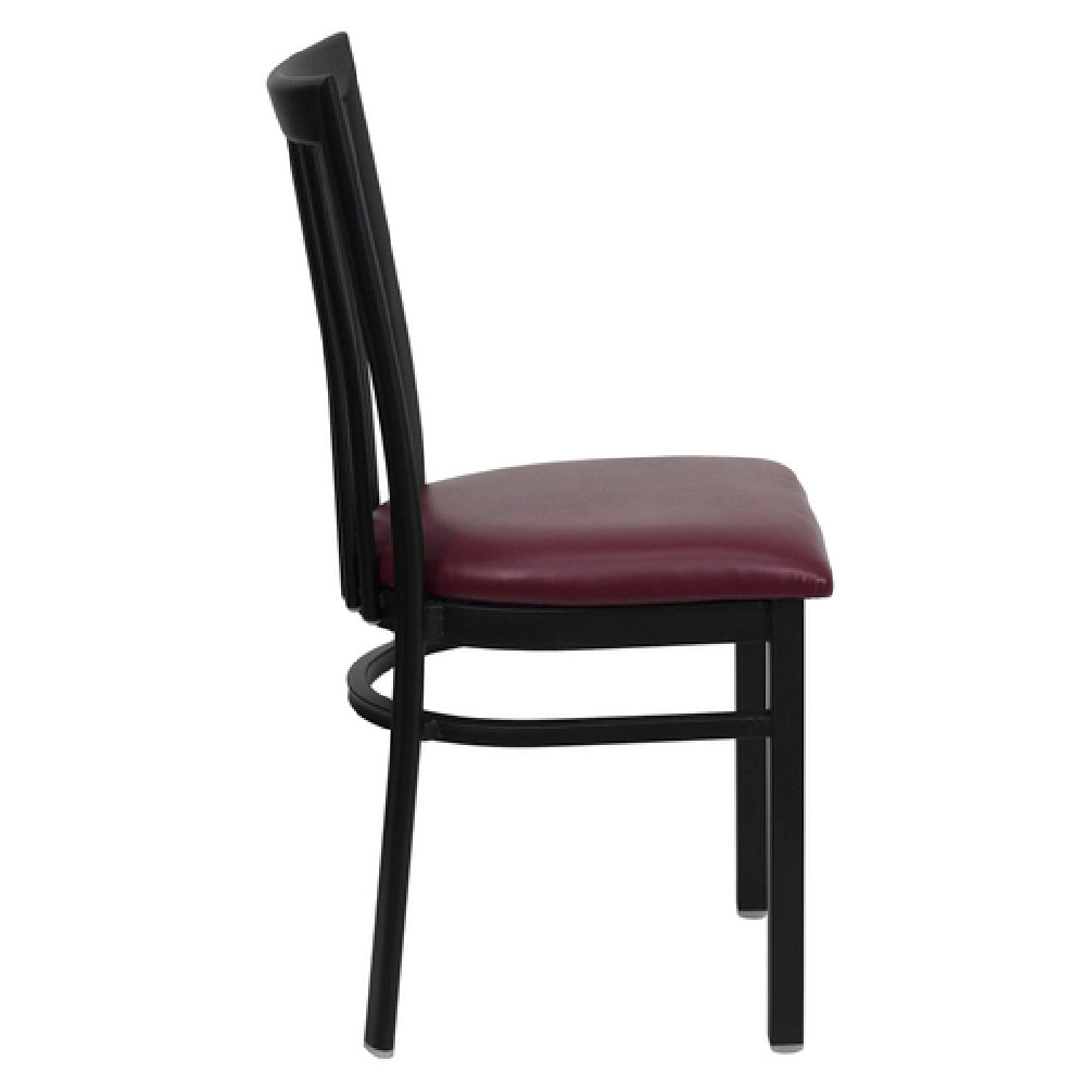 The Flash Furniture Hercules Series Restaurant Chair Metal Schoolhouse Back is a commercial-grade side chair designed for foodservice environments requiring durability and style. Constructed by Flash Furniture, this chair features a 17.25-inch wide, 18.75-inch deep, 34.75-inch high steel frame with a black powder-coated finish, ensuring corrosion resistance and longevity. The metal schoolhouse back provides structural support, while the burgundy vinyl upholstered padded seat, with a 2-1/2" thick CA117 fire retardant foam, offers comfort and safety. Suitable for cafes, diners, and institutional dining spaces, the Hercules Series combines technical robustness with comfortable seating, optimized for moderate throughput foodservice operations.