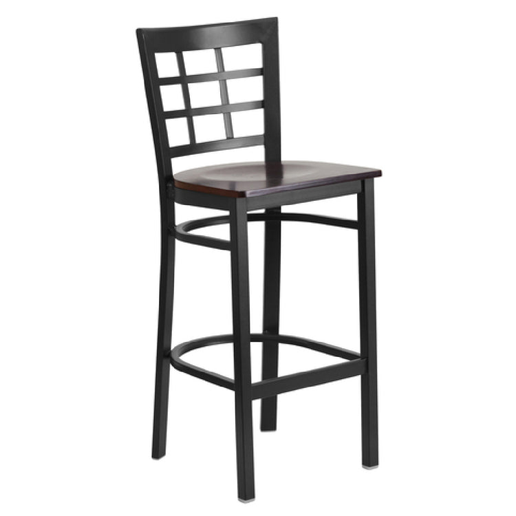 The Flash Furniture XU-DG6R7BWIN-BAR-WALW-GG Hercules Series Restaurant Bar Stool is a commercial-grade indoor seating solution designed for hospitality environments that require durable, functional, and stylish furniture. This bar stool features a sturdy 18-gauge steel frame with a black powder-coated finish, providing excellent corrosion resistance and longevity in high-traffic settings. The seat is constructed from 5/8" thick walnut finish plywood, ensuring comfortable support for prolonged use. Its metal window pane backrest offers both aesthetic appeal and ergonomic support, while the welded joint assembly enhances stability. The inclusion of two curved support bars and a footrest contribute to user comfort and proper posture, making it suitable for bar counters, restaurant service lines, or upscale lounge areas. This model is engineered for demanding commercial operations, providing reliable performance in busy foodservice venues.