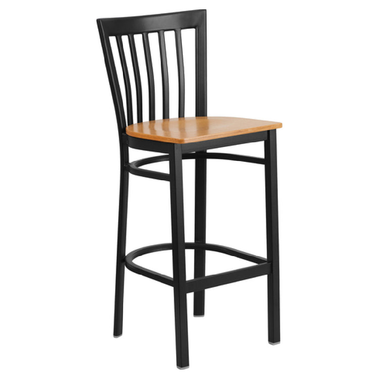 This restaurant bar stool offers a sturdy welded steel frame with a black powder-coated finish, ideal for high-traffic foodservice environments. The natural plywood seat provides comfort and resilience, resistant to frequent cleaning. Its armless, leg-based design facilitates efficient stacking and easy cleaning, while the metal schoolhouse back ensures reliable lumbar support during extended sitting periods. Suitable for bar areas or casual dining zones, it supports moderate to high use with minimal maintenance and reliable stability.