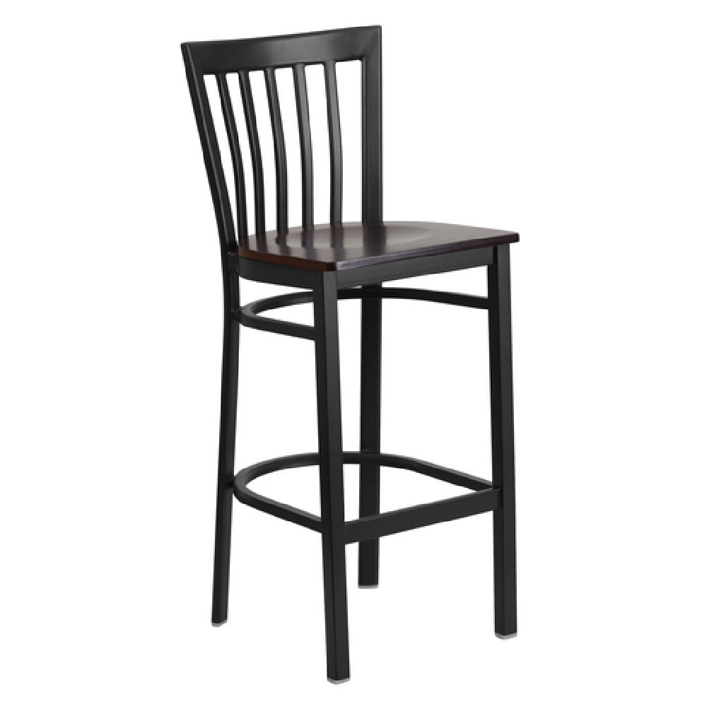 The Flash Furniture Hercules Series Restaurant Bar Stool, model XU-DG6R8BSCH-BAR-WALW-GG, is a professional-grade indoor bar seating solution designed for commercial foodservice environments. This metal-backed stool combines durability with style, featuring a 5/8" walnut-finish plywood seat mounted on a welded steel frame. Its classic slat-back design and robust construction make it suitable for bars, cafes, and restaurant settings aiming for longevity and ease of maintenance. The device’s structural components—including the welded joint assembly and steel support bars—ensure stable performance under moderate use, while plastic floor glides facilitate easy repositioning and protect flooring surfaces. With a height of 41.75 inches, this stool supports a comfortable seating position tailored for bar counters and high-top tables, making it ideal for high-volume hospitality applications requiring reliable, restaurant-ready seating.