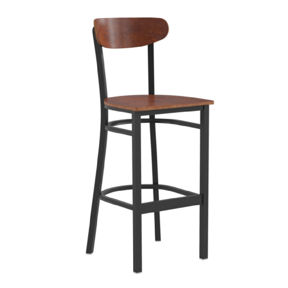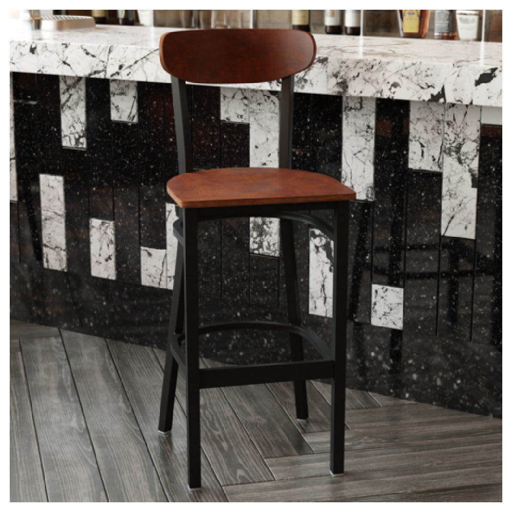 The Wright Bar Stool features a robust construction with a height of 43.12 inches, width of 16.25 inches, and depth of 18.75 inches, providing ample seating space for indoor dining and bar areas. Its weight of 61.4 lbs ensures stability and durability during frequent use. The upholstery incorporates vinyl materials optimized for easy cleaning and maintenance, compatible with standard cleaning routines. Assembling this stool involves attaching the wooden back to the steel frame using included fasteners, with no additional electrical requirements involved. The walnut finish enhances aesthetic appeal, while fixed floor glides facilitate secure placement on various flooring types. It complies with safety and safety standards applicable to commercial furniture, suitable for high-traffic hospitality applications.