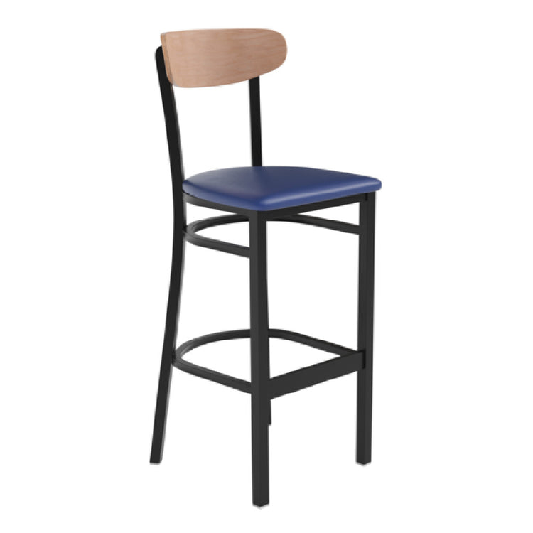 A commercial bar stool is a high-capacity seating fixture designed for use in professional foodservice environments, such as bars, restaurants, and cafes. It combines durable materials like steel and vinyl with ergonomic design to support sustained use. The Flash Furniture Wright Bar Stool XU-DG6V6BLV-NAT-GG features a 500 lb. weight capacity, vinyl upholstered seat, natural birch backrest, and a sturdy steel frame, making it ideally suited for busy hospitality settings and long-lasting performance.