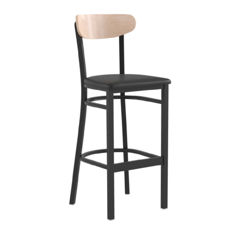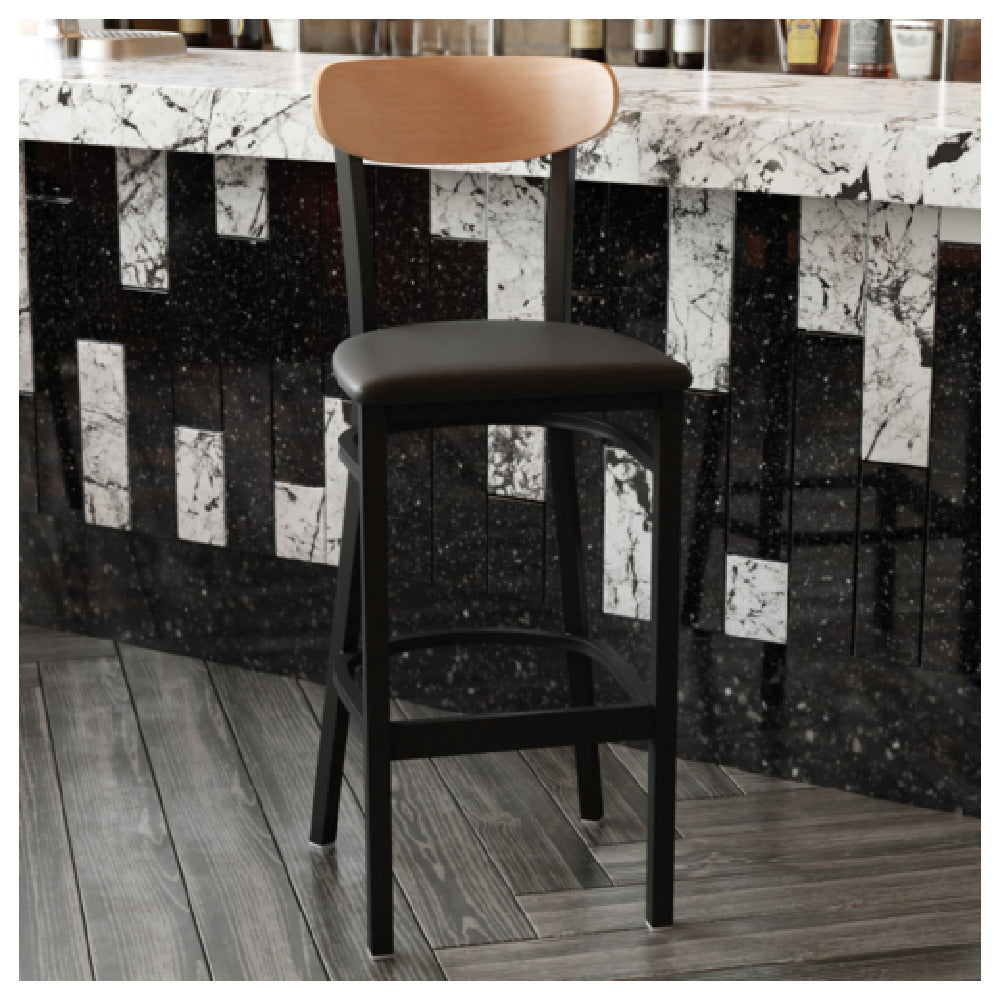 The Wright Bar Stool features a 17-inch wide and 18.75-inch deep seat with a height of 43.12 inches, designed for standard bar-height tables and counters. It incorporates a solid black steel frame rated for a 500 lb. weight capacity, ensuring stability under heavy usage. The vinyl-upholstered seat combined with a wooden backrest offers excellent resistance to wear and ease of cleaning. Assembly is required, with simple tools provided, and the fixed floor glides facilitate secure placement on various flooring types. Operating within typical commercial environments, it does not require electrical or cooling systems, focusing solely on structural durability and ergonomic support.