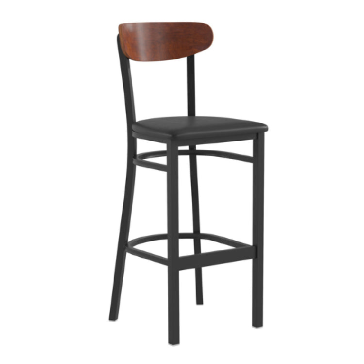 The Flash Furniture XU-DG6V6BV-WAL-GG Wright Bar Stool is a robust commercial-grade indoor seating solution designed for high-traffic foodservice environments. Crafted with a durable black steel frame, it features a 500 lb. weight capacity to support heavy-use applications. The stool's upholstered vinyl seat ensures comfort and wear resistance, while the wooden boomerang back provides ergonomic support. With a fixed height of 43.12 inches and a compact 17-inch width, it is optimized for bar counters, beverage stations, and social areas requiring reliable, restaurant-ready seating. Its technical construction addresses both stability and ease of maintenance in busy commercial settings.